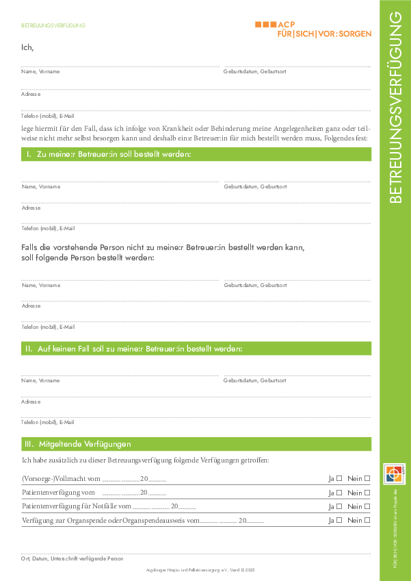 In einer Vorsorgevollmacht bevollmächtigen Sie mindestens eine Vertrauensperson, an Ihrer Stelle zu entscheiden und zu handeln, wenn Sie selbst dazu nicht in der Lage sind.