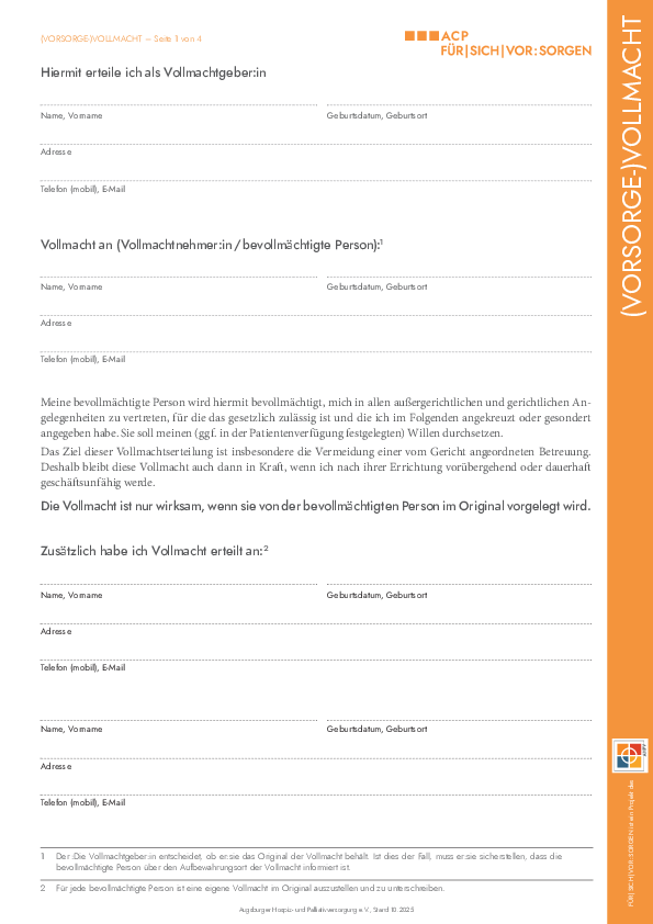 In einer (Vorsorge-)Vollmacht bevollmächtigen Sie mindestens eine Vertrauensperson, an Ihrer Stelle zu entscheiden und zu handeln, wenn Sie selbst dazu nicht in der Lage sind.